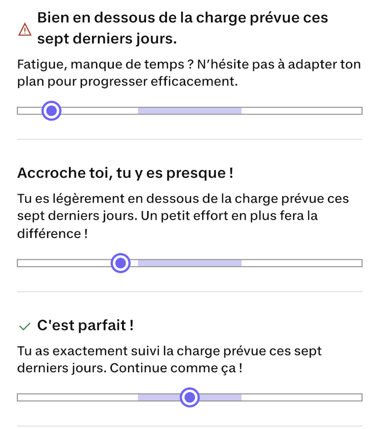 Nous évaluons l'écart entre ta charge d'entraînement réelle basée sur tes activités enregistrées (course, vélo, natation) et ta charge prévue pour atteindre ton objectif.