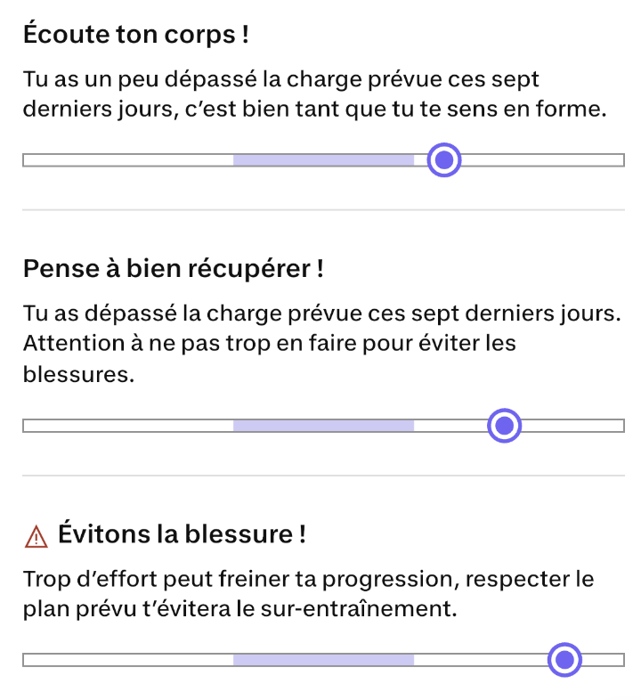 À travers les debriefings, l’application prend en compte vos niveaux de fatigue auto-déclarés ainsi que votre charge d'entraînement récente. Ces informations sont croisées pour vous fournir des indications personnalisées sur votre récupération.
